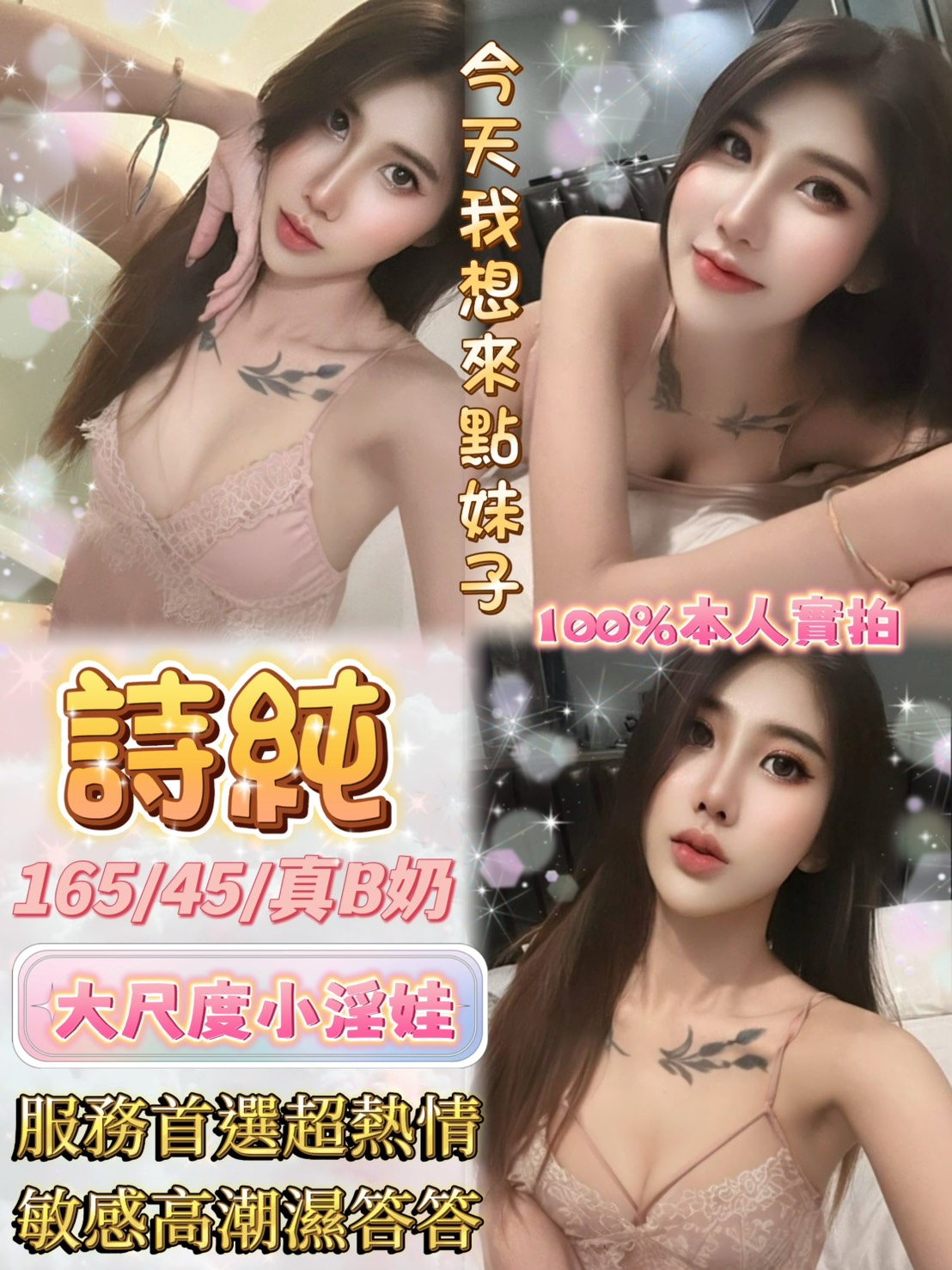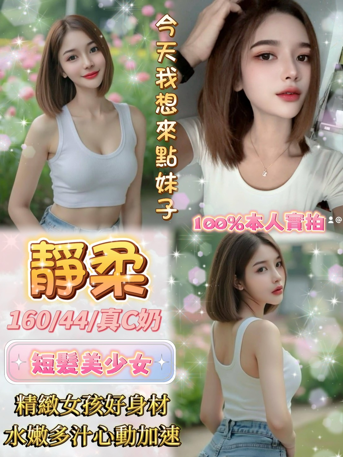她是「網美臉 × 情慾氣質的小美女型」,五官精緻、臉蛋討喜,帶點明星感的清甜外型,第一眼就很吸睛。互動時熱情不扭捏,情緒給得很滿,會主動營造氣氛,讓人很快進入狀況。說話溫柔、反應貼近,整體相處自然流暢,有被重視、被期待的感覺。身高約 164cm、體重 47kg,真C奶,身形苗條但不乾瘦,線條柔順、比例好,視覺清新又帶點女人味,屬於好看又耐看的類型。