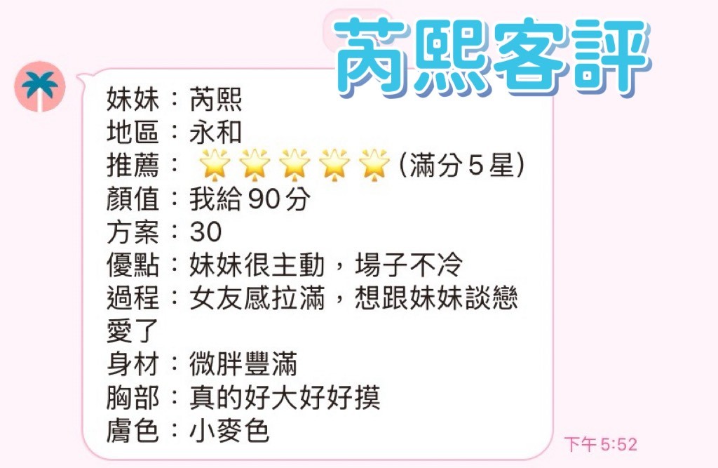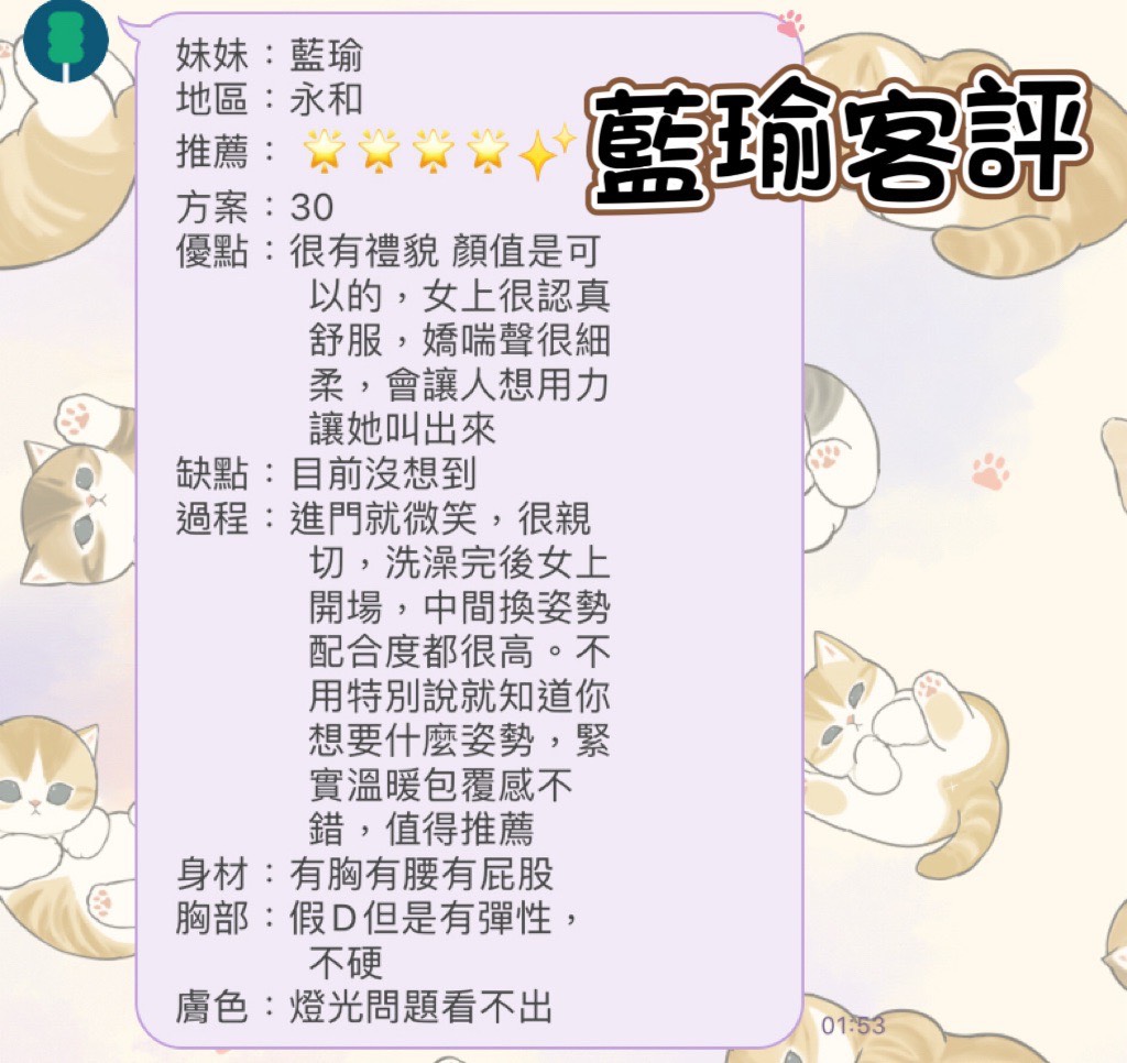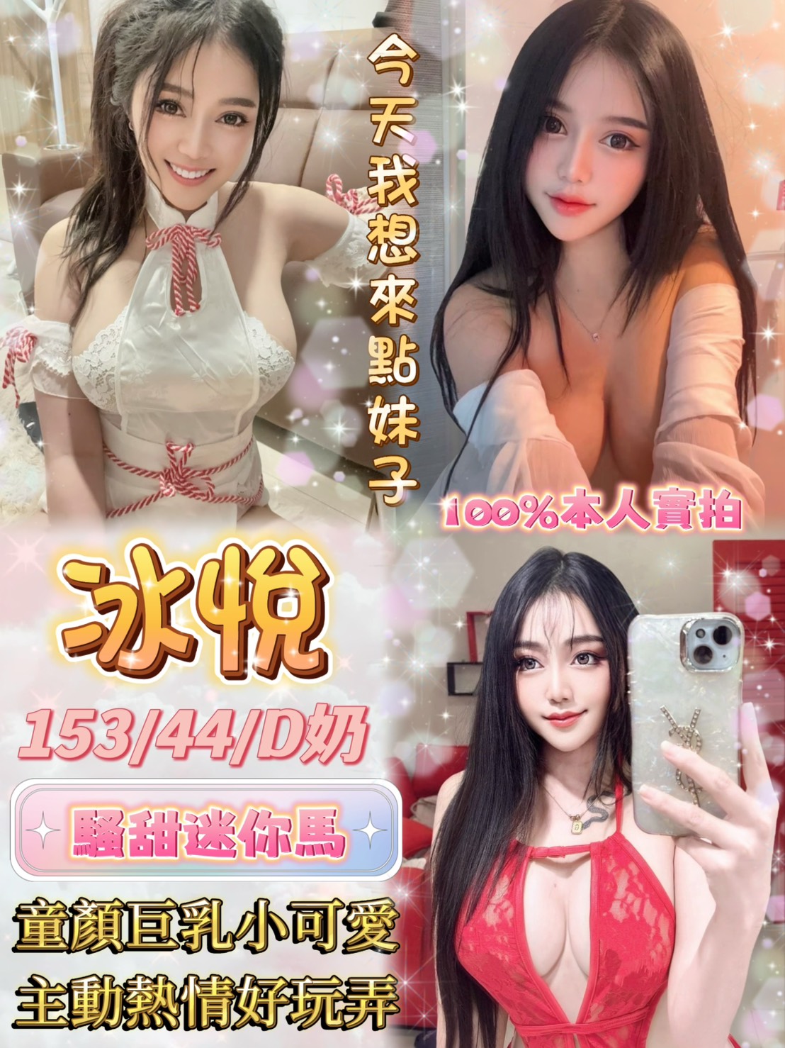 她是「年輕可愛 × 主動調皮型小隻馬」,外表清秀偏甜,臉蛋帶點稚氣感,但互動一開始就能感受到她的熱情與活潑。說話直率、反應快,會主動拉近距離,氣氛經營很自然,不會讓人冷場。相處時帶點調皮壞笑,情緒給得很滿,讓人一進門就被她的熱度包圍。身高約 158cm、體重 42kg,真C奶,體型嬌小卻有曲線,腰身明顯、比例集中,上半身存在感不低,整體是可愛中帶點性感的小隻馬路線。