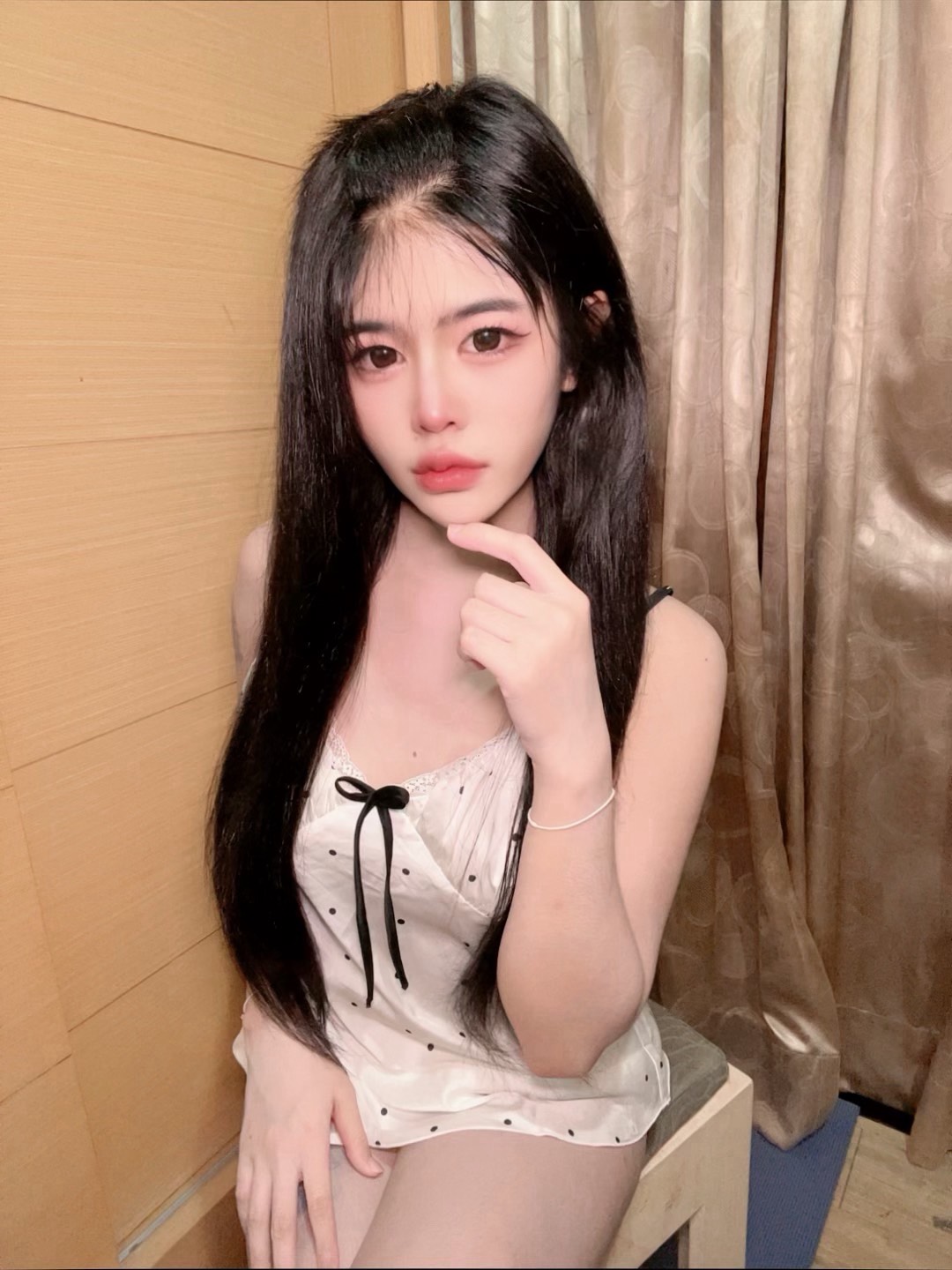 她是「清純外表 × 反差小壞感的長腿型甜妹」,第一眼給人乖巧乾淨的印象,臉蛋細緻、五官柔和,笑起來帶點無辜感,但互動後會發現她其實很會撩。說話溫柔、情緒貼近,會主動觀察對方反應調整節奏,互動自然不冷場。眼神交流多、黏人度高,屬於越相處越有女友感的類型,讓人不自覺放鬆又投入。身高約 165cm、體重 45kg,真B奶,身形纖細但線條勻稱,腿部比例特別突出,動起來很有存在感,屬於耐看型、回味度高的妹妹。